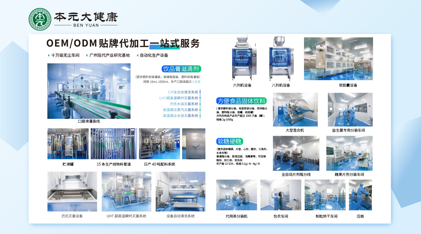 品牌名稱:本元大健康OEM代加工 主營產品:功能性飲品、膏滋、果凍 品牌特色:加工貼牌一站式服務