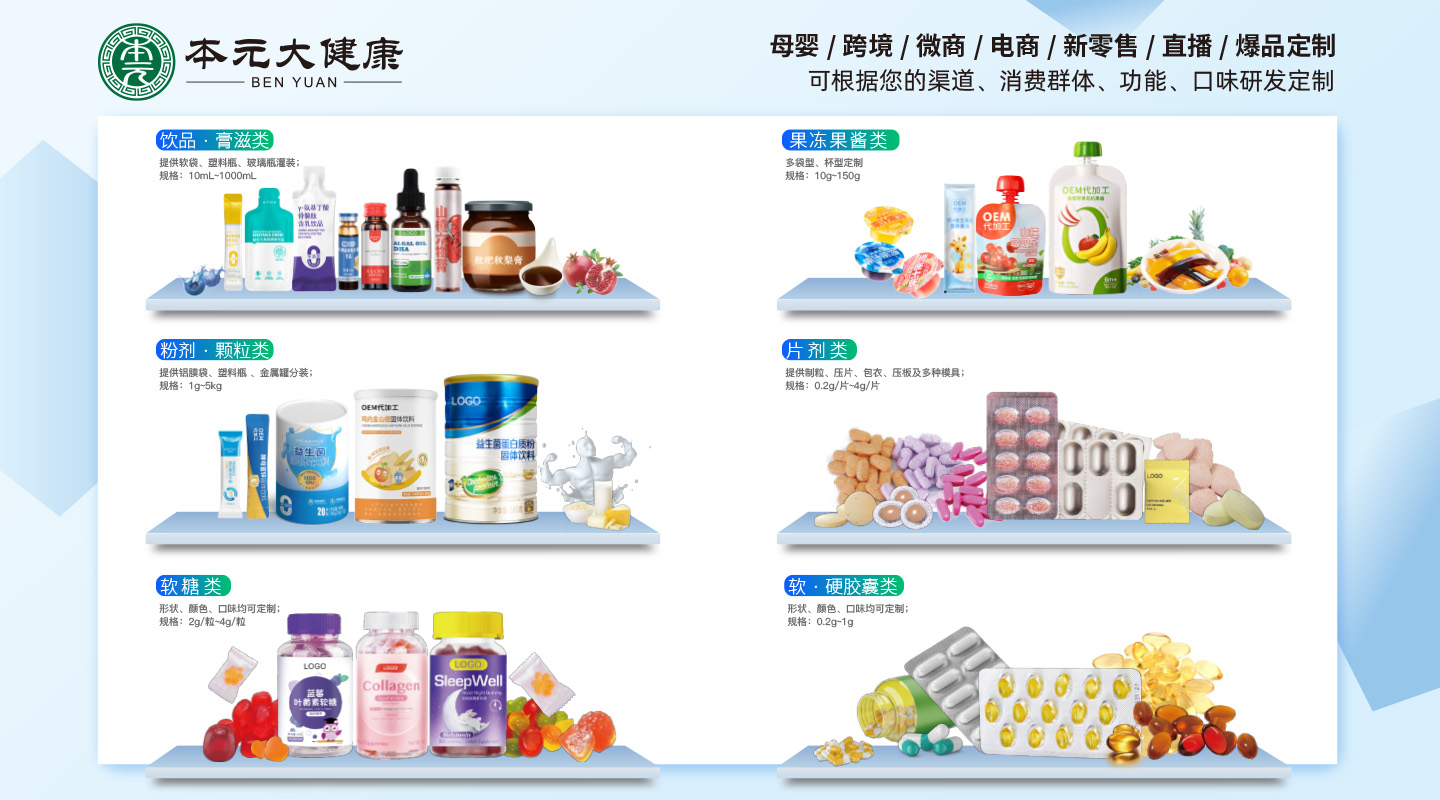 集團公司設有固體車間、液體車間、益生菌專用車間、果蔬發(fā)酵車間。是一家專業(yè)從事食品、功能食品、保健品OEM、ODM供應商,開發(fā)提供各種食品專利配方、藥食同源配方、功能性食品配方。針對美容院線、微商團隊、直銷團隊、電商平臺、抖音商戶等各種渠道開發(fā)針對性產品,保證產品開發(fā)技術的實時性與獨創(chuàng)性,公司可以根據客戶需求提供專業(yè)配方,并協(xié)助客戶申報專利。