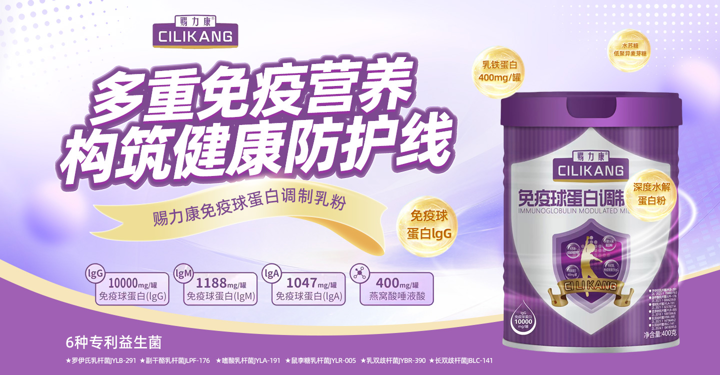 賜力康免疫球蛋白調(diào)制乳粉,多種核心營(yíng)養(yǎng),科學(xué)配比,每罐添加乳鐵蛋白400mg、免疫球蛋白IgG 10000mg、免疫球蛋白IgM 1188mg、免疫球蛋白IgA 1047mg、燕窩酸400mg,還添加6種專利益生菌、牛初乳、水蘇糖、低聚異麥芽糖、深度水解蛋白粉、鈣鐵鋅硒等,多重免疫營(yíng)養(yǎng)標(biāo)本兼顧,為全家人構(gòu)筑健康第一道防護(hù)線。